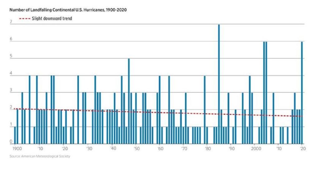 In the same vein, the Wall Street Journal had a piece by Bjorn Lomborg also looking at this issue from a different angle but with the “compared to what?” question in mind. First, he had a chart looking the number of hurricanes making landfall over a 120 year period.